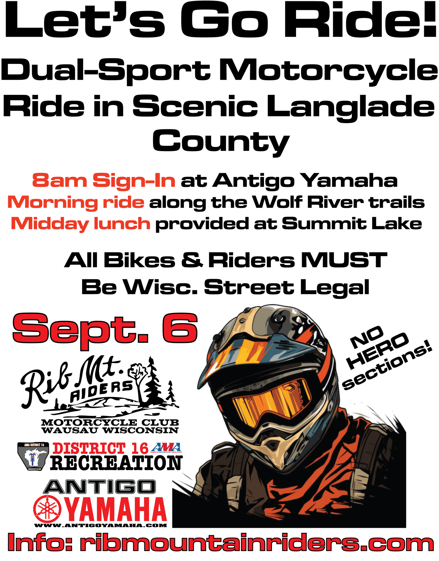 Sign-in & depart from Antigo Yamaha. Cost is $35 if you pre-register, $40 if you wait until the day of the ride. Cost covers an event T-Shirt and meal at Summit Lake.